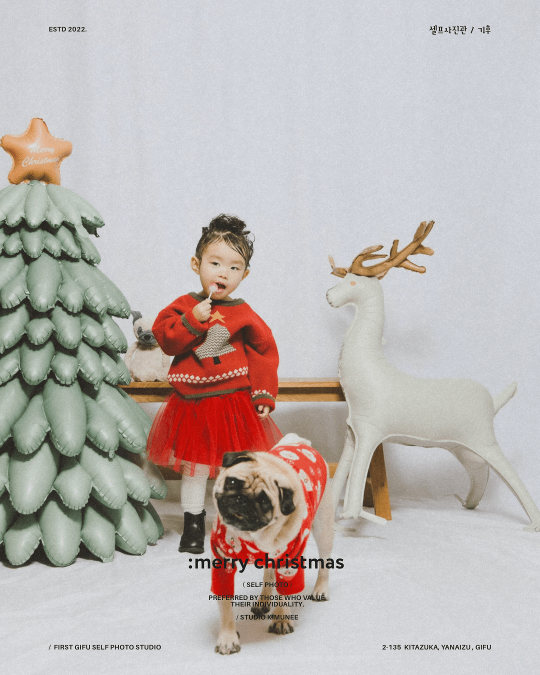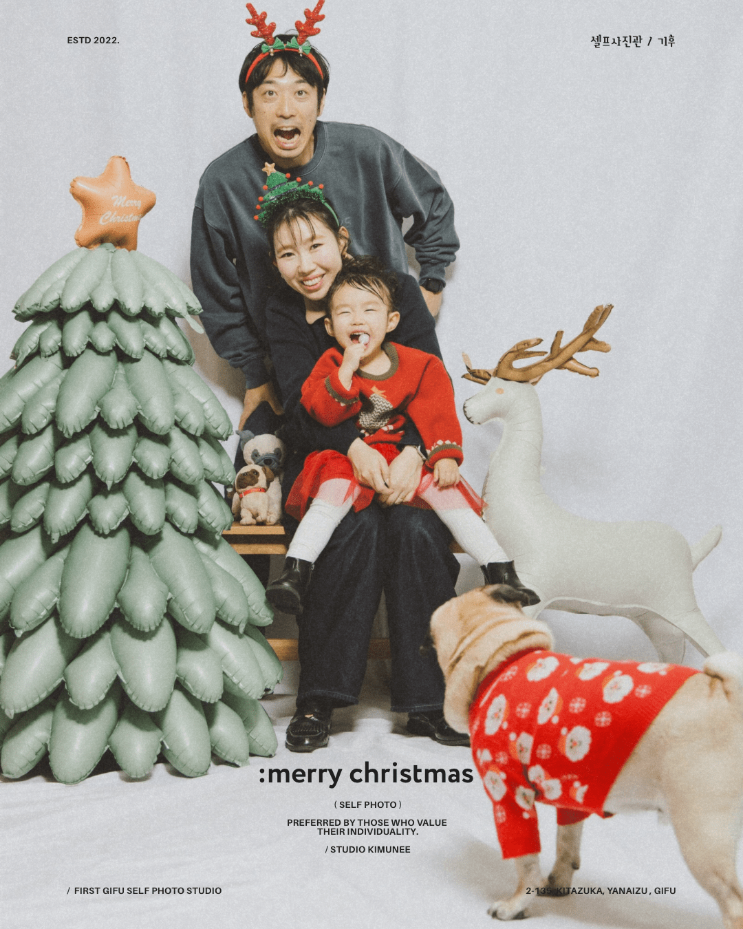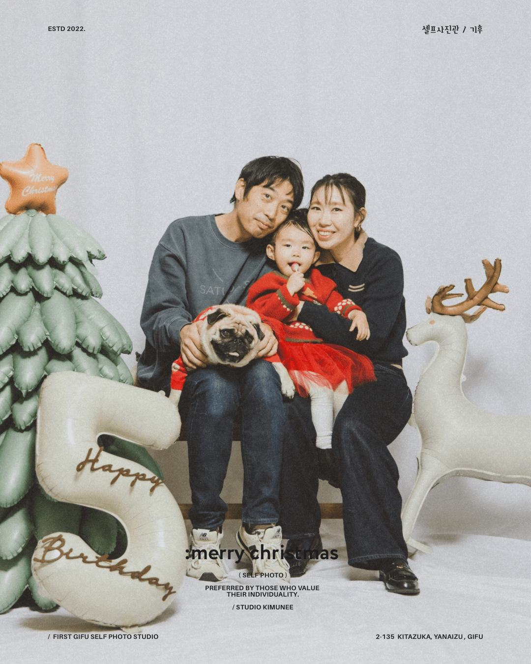 「 merry christmas~!! 」 明日はクリスマス〜🎄 ママパパサンタさんたちには忙しい夜です〜!✨ 家族みんなで 楽しい思い出いっぱいつくりしよう〜!🎉 →スタジオキムニーのセルフフォトplan 貸切で15分撮影、 撮った全データ込み、 お一人様2000円 *ご予約はDMにて! (ご希望の撮影日と人数を教えてくださいね〜) #セルフ写真館岐阜 #セルフフォトスタジオ #studio_kimunee #スタジオキムニー #クリスマス写真セルフ Category *Self Photo Loading 投稿ナビゲーション Previous PostPrevious 「 年末年始休まず、」Next PostNext「 maternity. 」