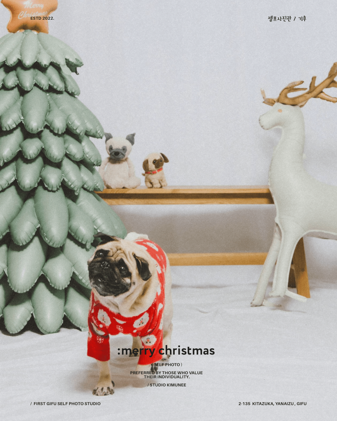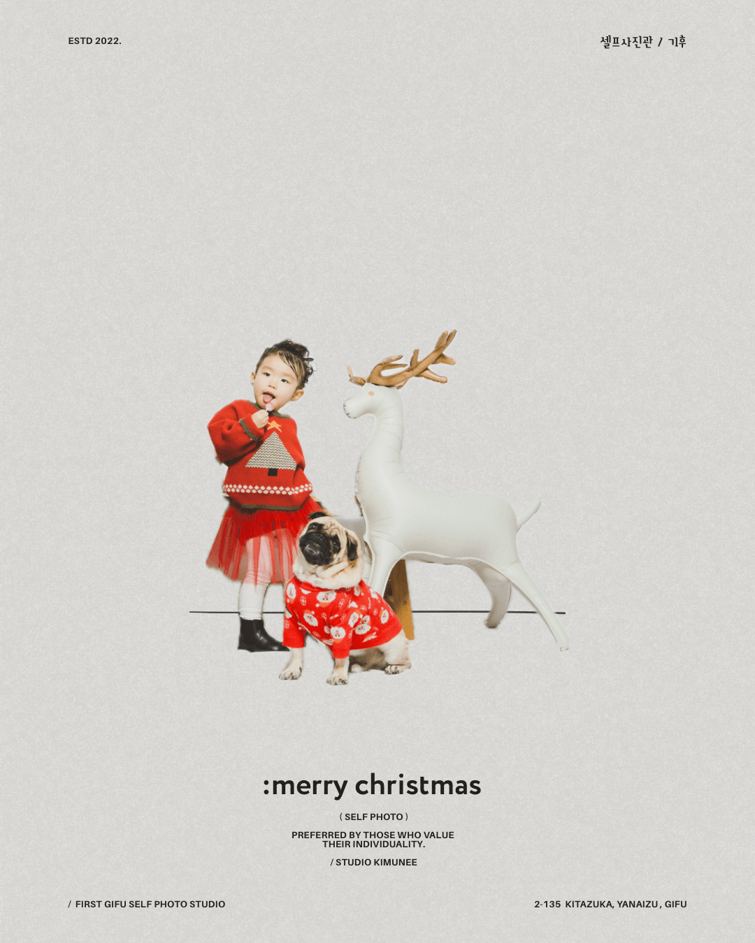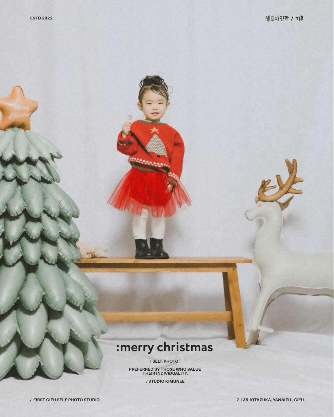 「 merry christmas~!! 」 明日はクリスマス〜🎄 ママパパサンタさんたちには忙しい夜です〜!✨ 家族みんなで 楽しい思い出いっぱいつくりしよう〜!🎉 →スタジオキムニーのセルフフォトplan 貸切で15分撮影、 撮った全データ込み、 お一人様2000円 *ご予約はDMにて! (ご希望の撮影日と人数を教えてくださいね〜) #セルフ写真館岐阜 #セルフフォトスタジオ #studio_kimunee #スタジオキムニー #クリスマス写真セルフ Category *Self Photo Loading 投稿ナビゲーション Previous PostPrevious 「 年末年始休まず、」Next PostNext「 maternity. 」